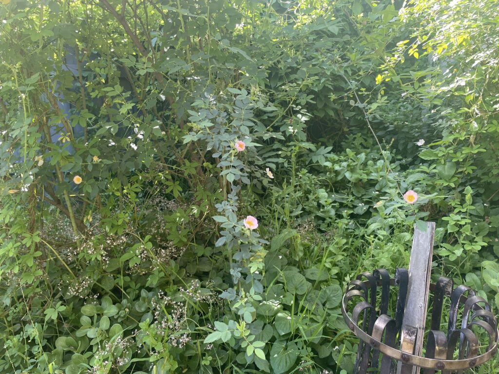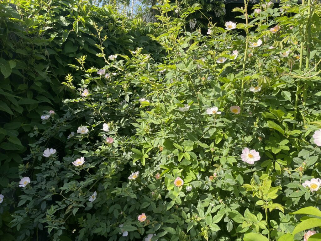 These are two self-seeding rose bushes that I decided to encourage a few years ago. They have decided to burst into flower this Spring. Yay!